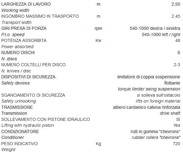 Frontal Disc Mowerconditioner. Frontal mounted, special relief system by a parallelogram suspension. It perfectly follows the soil even if disconnected.