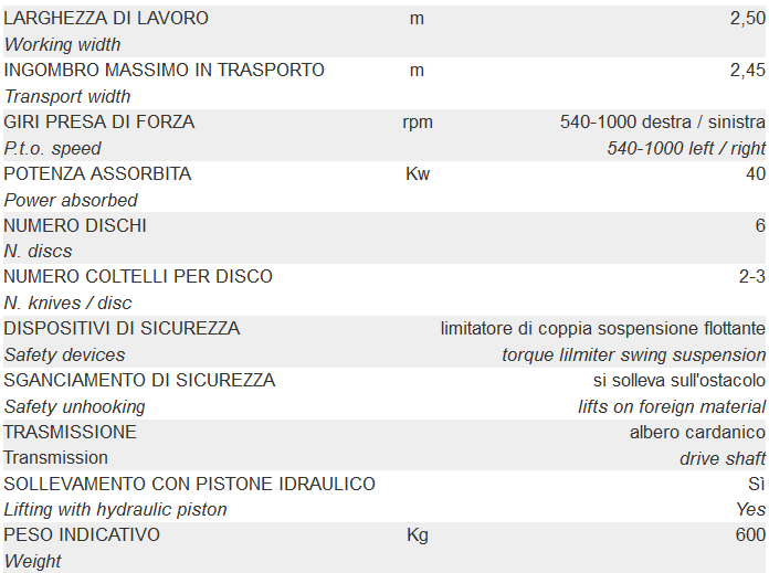 Frontal Disc Mowerconditioner. Frontal mounted, special relief system by a parallelogram suspension. It perfectly follows the soil even if disconnected.