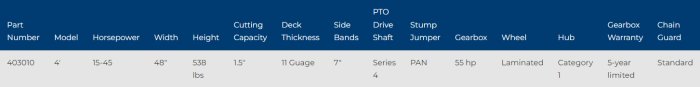 The Blue Diamond® 4′ Rotary Cutter is designed for standard duty applications such as weeds, grass, and light brush up to 1.5” diameter. This cutter is designed to work with 15 hp to 45 hp tractors and cuts up to 48″. This cutter uses a single spindle with two free-swinging blades, which reduces the shock of impact when a stationary object is contacted. A standard slip clutch protects the gearbox and driveline from damage. Standard equipment includes driveline, shields, clutch shields, and front and rear chains.