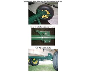 6 Ton Running Gear: Axle- 3` X 6` rectangular tubing. 1 5/8` reinforced high-carbon steel spindles. 6 bolt hubs. 15` X 8` rims with new 11L15 tires. 72` tread width. Solid or telescoping tongues available. Adjustable center reach pole with safety chain. Heavy duty adjustable cuffs.