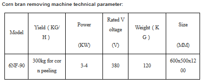 6NF-90 multifunctional corn peeler machine can remove the bran both of corn and wheat. There has 380V motor with 3-4KW power installed inside. It can process 300kg of grains, such as corn, wheat, sorghum and rice.