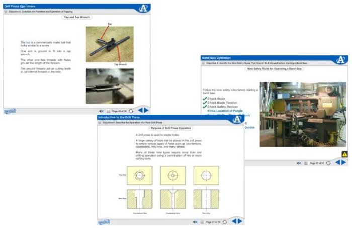 Interactive Multimedia Curriculum Covering Drill Press and Band Saw Safety Through Machine OperationThe Machine Tools 1 curriculum covers the function, parts, layout, operation, and applications of the band saw and drill press. As more in-depth examples, learners will study: the safety rules for band saws and drill presses that should be followed before and during operation; the operation of a twist drill; mounting a workpiece in a drill press vise; and the function and operation of reaming, countersinking, counterboring, tapping, and chamfering. This learning system’s curriculum is presented in an interactive multimedia format that can be accessed anywhere, anytime with a computer and internet access. This on-the-go learning solution features all of the in-depth content that Amatrol is known for with the addition of stunning 3D graphics, videos, interactive quizzes and exercises, and voiceovers of all text.