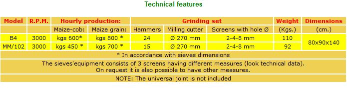 The mill model `B4` grinds maize and any forage product. It works with tractors from 18 to 50 HP. The mill model `MM/102` is suitable for grinding any zootechnical product. It works with tractors and motocultivators from 15 to 40 HP. Shaft not included