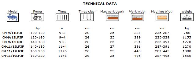CM-LP3F spring loaded tine tiller cultivator is a machine suitable for tractors with power ranging from 120 to 220 HP; very versatile machine ideal for cultivation of land with dry or humid loose packed soil, mixed soil or land mainly consisting of stones.