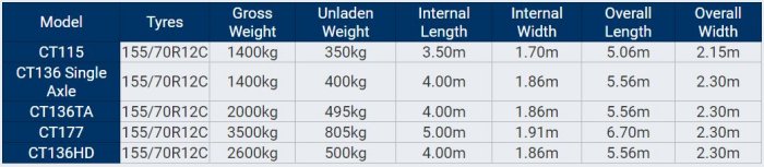 Utilising the same lightweight construction on all four models, the single axle CT115 and CT136 (1400kg gross), twin axle (2000kg gross) and heavy duty (2600kg gross) models are lightweight trailers giving a maximum payload capacity of 1000kg, 1500kg and 2100kg respectively.