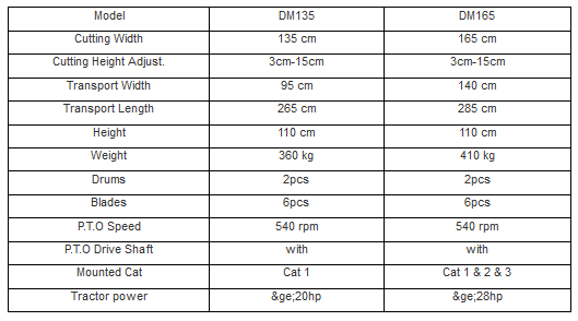 - CAT 1 hitch for DM135, CAT 1,2,3 hitch for DM165,185.