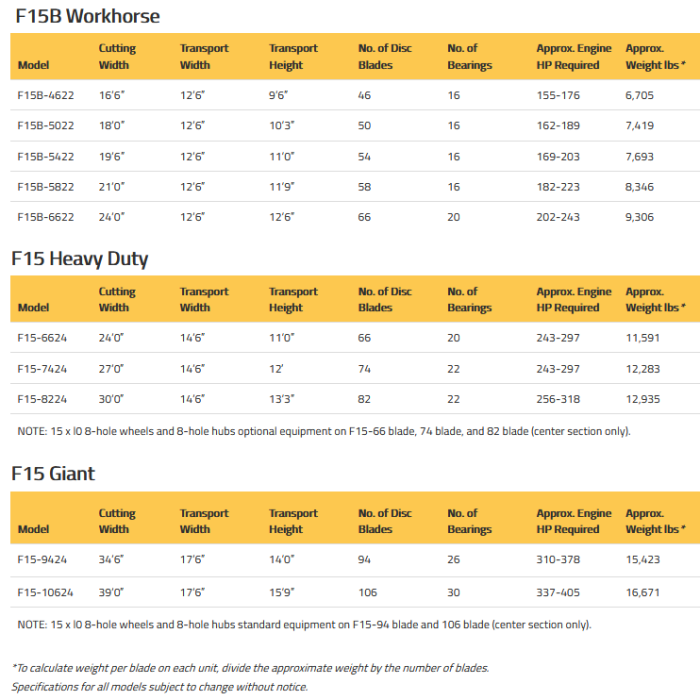 - All models feature smooth blades with two feathering blades on the rear gangs; blades sizes are 22″ x 1/4″, 24″x1/4″, or 26″ x 1/4″, depending on model and options chosen