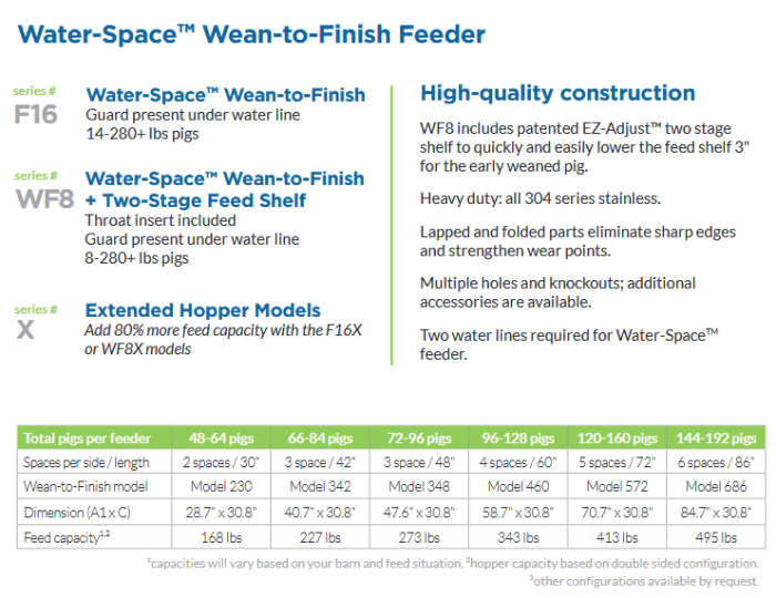 Water-Space enables easy and natural water consumption. Wet/Dry feeding improves daily gain while decreasing feed and water waste. Pigs as small as 8 lbs (3.6 kg) benefi t from additional gain of Wet/Dry feeding. Patented EZ-Adjust is a quick, easy, and repeatable adjustment providing precise feed fl ow control in 1/16” (1.5 mm) increments. Feeds up to 16 pigs per space on wean/fi nish feeders.