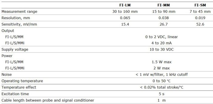 The FI-type sensor consists of an LVDT transducer mounted in a special clip and a DC powered signal conditioner.