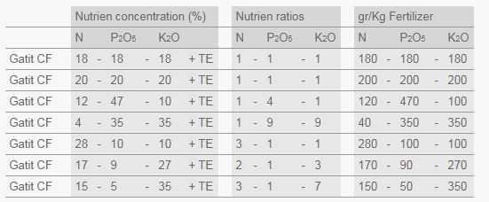 The most common Gatit CF formulas are as follows: Upon request special Gatit CF/RC NPK combinations can be customized to satisfy your crops’ needs, subject to minimum order.
