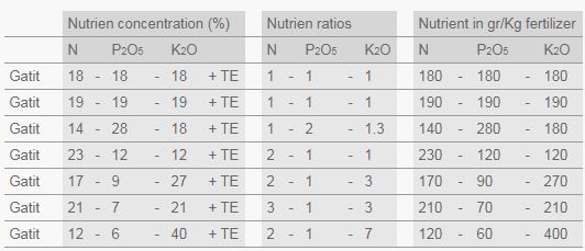 The most common Gatit RC formulas are as follows: Upon request special Gatit CF/RC NPK combinations can be customized to satisfy your crops’ needs, subject to minimum order.
