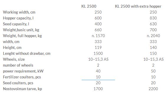The KL combined seed and fertilizer drill with side wheels and hoist fittings is a traditional, easy to use drill. The KL combined seed and fertilizer drill can be equipped with extra hoppers in order to facilitate a large bag of fertilizer. The machine’s centre mass is located near the tractor, facilitating safe operation even with smaller tractors. The machine’s tractive resistance is small. The machine features wheels with tractor patterns that provide buoyancy. The machine’s feeding roller is extremely precise, easy to adjust and suitable for all seed types. The location of the metering chambers ensures a steady feed even in slopes or with poorly settling seed types. The KL combined seed and fertilizer drill has a large selection of accessories from seed sowing electronics to roller wheels