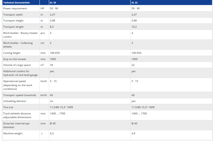 For lavender mowing and collecting. Hydraulic opening of the rear unloading lid (KL 18 modification) and elevator unloading of KL 22 (with rear elevator).