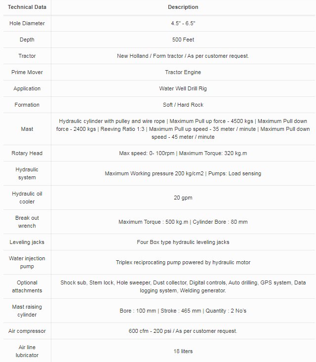 We offer KLR Tractor Mounted Rigs, which are available in various models, sizes, and working capacities. The equipment is provided with a water injection pump, hydraulic system, rotary head that helps in performing 4 1/2" to 6 1/2" dia. boreholes up to 500 ft. Known for their excellent rod handling capacity. These drill rigs are suitable for hole dia 4.5-6.5” up to depth 500 feet.