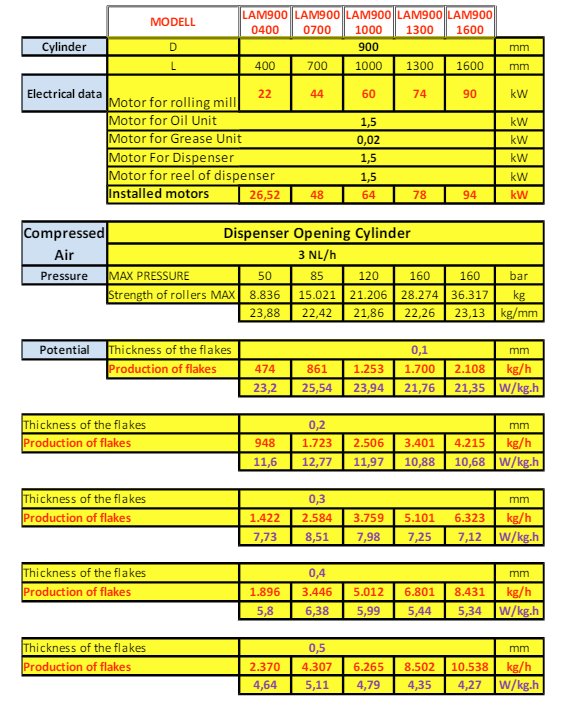 The large diameter of the cylinders has been chosen equal for all models of Thermo-Flaked series ``LAM900``, as obtained from a precise calculation that evaluates the cone formed between cereal and steel and the tightening angle between the two cylinders (Nippel angle), previous crushing, variable decreasing with the increase of the diameter.