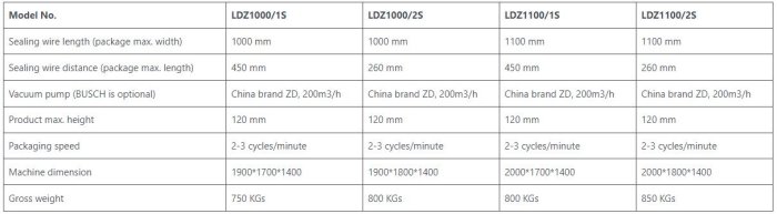 There are 4 regular models of belt type continuous vacuum packaging machine, which are different in sealing bar length (100 cm, 110cm) and sealing bar quantities (1 PC, 2 PCs). Please select the right machine according to your package dimensions. The maximum pouch length can be customized at extra price.