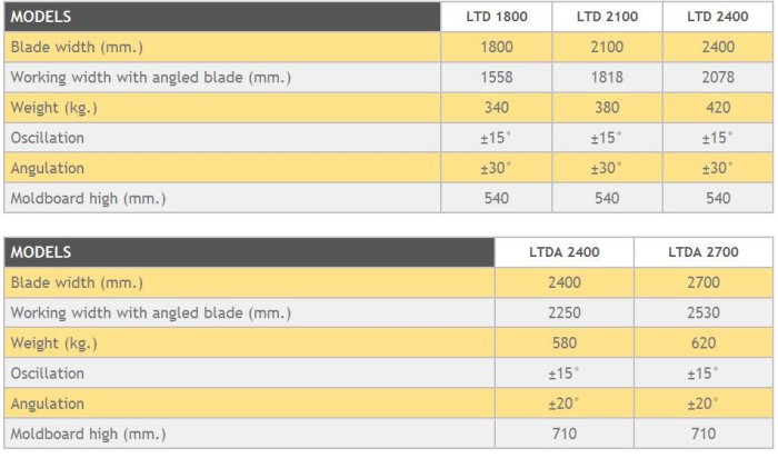 Tilt dozer blade and high tilt dozer blade with double effect cylinders for left-right hydraulic oscillation and angulation, rubber pipes and quick couplers for the hydraulic circuit supply and universal linkage plate.Laser support plate included on LTDA models.