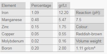 Chelated nutrients, including: iron (Fe), manganese (Mn), zinc (Zn), copper (Cu), molybdenum (Mo) and boron (B) as required.