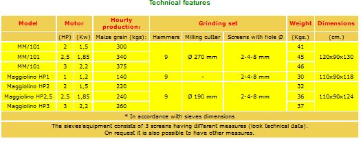 This is a complete set of mills for maize, working with monophase or threephase electric motors. These models are also available with shelling machine. It is also possible to buy the shelling machine as fitting separately. These mills are used to grind maize-cobs and similar products for cattle feeding