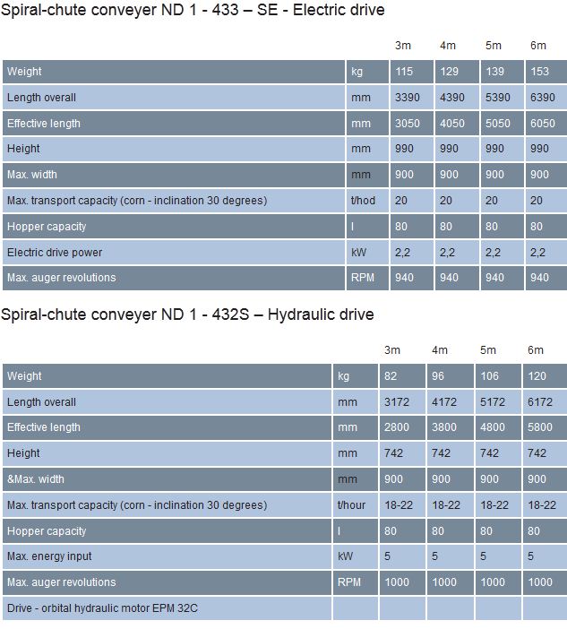 Spiral-chute conveyers are designed for the transport of grains, grouts, solids and other loose materials, especially in agricultural production. Spiral-chute conveyers driven by hydraulic motors are designed to fit on trucks and on agricultural trailers and for the filling of sowing machines. STS Olbramovice produces a variety of these conveyers in various lengths and with a unified transport tube diameter of 127 mm. You can choose between an electric and a hydraulic motor. The basic length is 3 meters. You can change the conveyer`s length to fit your needs through the use of extensions.
