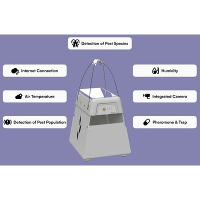 PestTrap is an IoT pest-tracking station that uses machine learning to identify and count pests in real-time. Used to attract insects with its pheromone trap lure, PestTrap optimizes crop yields while reducing the economic impact of pest-related crop damage. Compact by design and ideal for outdoor use in any weather condition, our digital trap ensures reliable pest tracking with uninterrupted data flow. Protect your field with the environment-friendly technology of PestTrap!