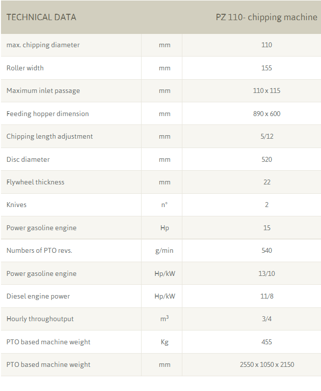 Also aware of the needs of small-scale users, PEZZOLATO offers them this easy-to-handle and compact machine, with two horizontal rollers to convey the material under the action of the chipping machine flywheel knives. The feeding hopper can be tipped, in order to reduce overall dimensions and ease towing of the machine. It is the small professional chipping machine that can reduce logs and branches with diameters up to 110 mm, realising hourly production of 3/4 m3 . The machine can be driven by tractor PTO or by an internal combustion engine (petrol [MB] or Diesel [M]). The motorised version is supplied (standard) with small wheels for manual movement. On request it can be trailer-mounted for slow or high speed transport.
