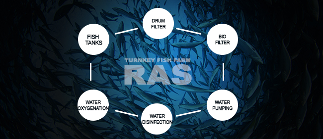 RAS - a recirculating aquaculture system is a practically closed production circuit system, where more than 90% of the technological water is purified, saturated with oxygen and returned or reused continuously in production tanks.