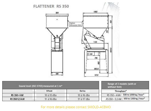 Ideal flattener for any size of grain (cereals, corn, peas, lupin, horse, bean,..)alone or mixed. The big grains are first crushed between the little roller and one of the largest rollers ; flattening is then made between the two large rollers. Specialist in breeding equipment for over 60 years SKIOLD- ACEMO has emerged over time as one of the best specialist in the food preparation equipment. Ecomonic constraints related to the advancement of knowledge in animal nutrition make use of the flattened cereals increasingly widespread in our farms. Based on the experience with thousands of flatteners, SKIOLDACEMO has developed the RS 350 to expand its range and to offer to farmers the most suitable product to their needs.