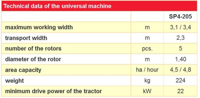 Machine SP4 - 205 is the simplest model produced by Strojírny Rožmitál.These are the designated radial machines that can also be attached to the three point hitch of a tractor.Maximum working span of the SP4 - 205 is 3,1/3,4 m when tedding/raking.These machines tedd and rake by adjusting their radial wheels aslant according to the direction of the movement roll on the ground. To convert their activity, the frame of the machine can be turned through 180° by a simple and speedy operation. By turning of the frame the machine changes either into a tedder or a delivery rakes. Due to their simple construction, undemanding maintenance and low price, the radial tedders and delivery rakes belong amongst the best selling products.