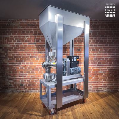 Optimize your production process with the XXL Silo System, the perfect complement to your ölwerk oil presses of the OW5500s-inox and OW7500 s-inox models, ensuring a seamless 24-hour operation. With this system, boost your productivity and secure a continuous and effective oil production. The integrated seed supply control of the silo system allows you to precisely manage the flow of seeds and to pause for thorough, seed-free cleaning of the press after operation. Hygiene is of the utmost importance – the seed container and the frame are made of high-quality stainless steel, which is easy to clean and ideal for food production. The mobility of the XXL Silo System is a crucial advantage in your production environment. Thanks to the castors, the system can be easily positioned. Two lockable castors provide the necessary stability while working with the oil press.