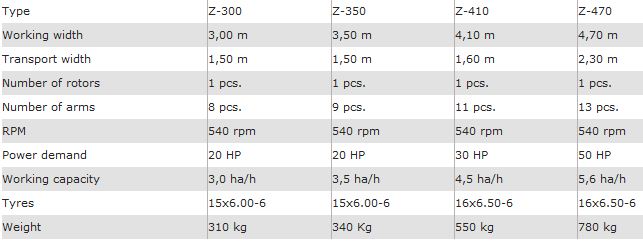 Combines functionality of Z2-780 and DUO 680, making 1 or 2 swath rows. Setting carousels near the central drawbar results in single row delivery, extending them outside makes two rows. New generation, 11-arm gearbox with strenghtened, connecting- -rods has been applied. Additionally, the rake has a patented „gearbox angle changing mechanism”, which provides protection to drive shafts when lifting the machine to transport position.