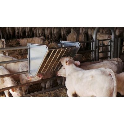 Ratelier modulable sur barrière modèle "veau" long 1m. Ratelier se posant sur une barrière, fond et côtés tôlés barreaudage en tube D.27mm. Espace entre barreau 7.5cm pour veau.