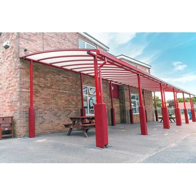 The ‘Mono’ is our monopitch (asymmetric) curved roof variant - this is where one side of the roof is higher than the other, the standard configuration for canopies located against building elevations. Widths of 10000mm are easily achieved and wider still with additional design features. Popular applications include covered walkways, play area canopies and outdoor dining areas.