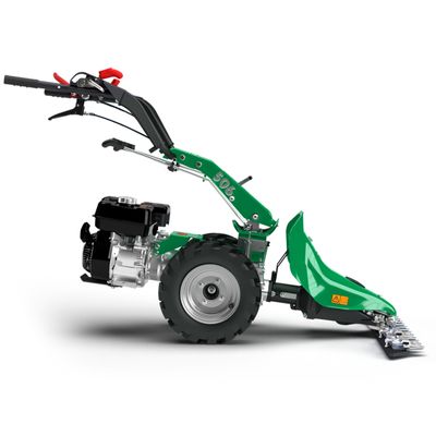 The 506 PowerSafe® mower is a lightweight and compact motor mower designed for ease of use, even by occasional operators. It is highly portable, fitting easily into cars or small vans, making it ideal for tending to small plots, private gardens, or restricted spaces. The mower features a mechanical transmission and a unique hydraulic PowerSafe® clutch with multi-disc oil bath activation, ensuring reliability, comfort, and high performance under various conditions. This mower offers a 2+2 gear ratio and an independent PTO running at 990 rpm, allowing it to efficiently manage diverse tasks. It lacks a differential, work brakes, or parking brake, and has an optional quick tool attachment. The adjustable handlebars are mounted on a silent-block to reduce vibrations. The mower is powered by a Genkins GK210 engine with a power output of 4.4 kW or 5.9 hp, capable of achieving a maximum cutting width of 100 cm.