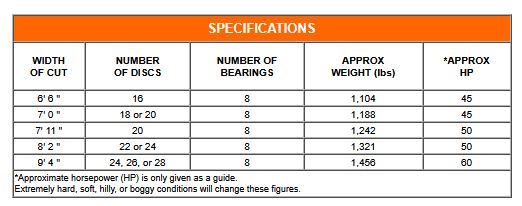 Standard Equipment; Category II Hitch. 1 1/8 ` Square Steel Axle. Relube Ball Bearings. Adjustable Angle of Cut - 13° to 21°. Disc Gang Wrench. Disc Spacing – 7-½`, 9`, or 9` Front / 7-½` Rear. Extra Equipment; Heavy Duty Scraper Blades. Cover Disc. Balk Buster.