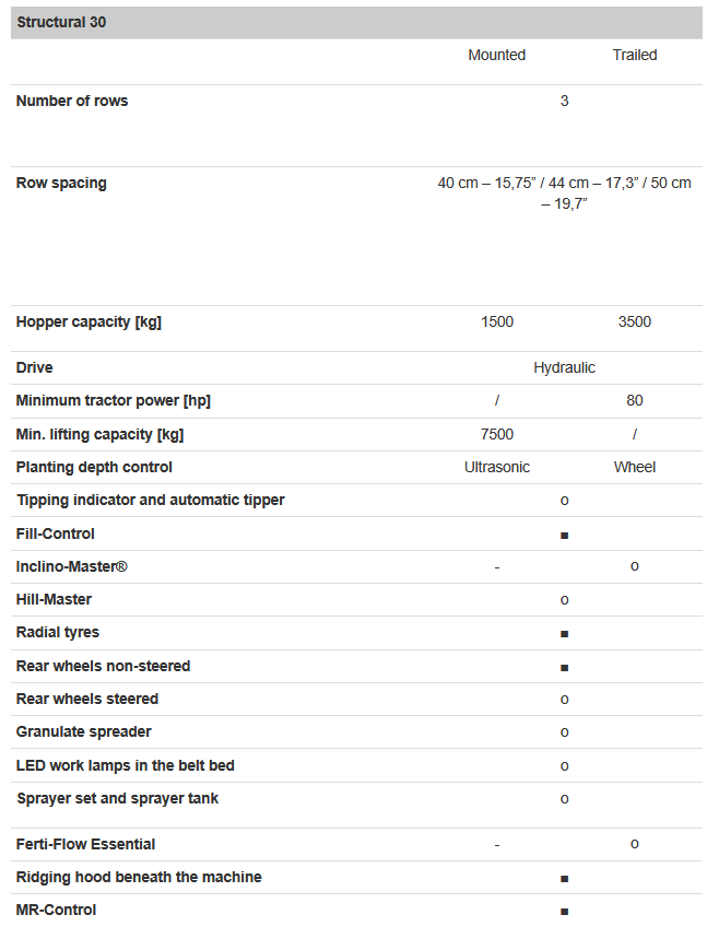 The Structural 30 is a mounted or trailed 3-row belt planter that plants 3 rows in a potato bed as standard. The planter is equipped with numerous innovative features that make planting more enjoyable for the grower. For example, the wave-shaped planting belts – the ‘Wave Belt’ concept – prevent the seed potatoes from rolling to one side on sloping terrain. This innovation is seed potato-friendly, ensures proper placement and guarantees high capacity. When planting with the Structural 30, uneven terrain is no longer a concern. Thanks to the patented Inclino Master® technology the furrow opener follows the contours of the field while the planting unit and the bunker are kept level. This allows the driver to concentrate fully on the planting, without having to worry about rolling potatoes. Other exceptional features of the Structural 30 are a very small turning radius for high manoeuvrability and the possibility to plant with two rows.
