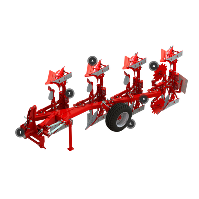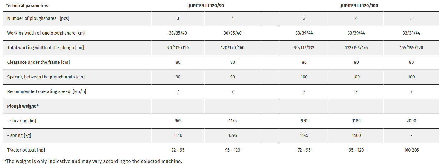 JUPITER III 120 models are three-, four- and five-plough bodied mounted reversible ploughs designed for tractors from 70 horsepower. During construction emphasis is placed on low weight combined with long service life of all components.