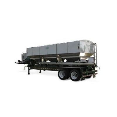 The 34 foot trailer is a dual axle, drop deck design. The 10 foot top deck has a mild steel plate cover, and a set of mild steel catwalks. These allow the operator access to the motor, hydraulics, tanks, and front bin levels. A set of fenders on the rear keep mud and water from being thrown by the tires. Access to the rear bin levels is accomplished by climbing the ladder mounted on the rear of the unit.