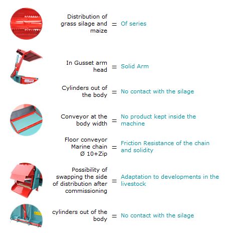 Silage: Round Silage rake, 1 cylinders on the arms (cylinders and arms out of the body), 1 cylinders on the silo-unloading rake. Shredding - Dispensing – Mulching: 1 rotor hydraulic driven, 1 cylinder on the unloading deflector, Trap door of unloading opposite at the rotors (manual), Unloading on the right or left (to precise). Belt conveyor: Conveyor Marine chain Ø 10, bars in removable rectangular tubes with manufactured ends®, Conveyor electrical regulator of hydraulic flow with reverser of rotation sens, Indicator of speed direction of the floor conveyor. Design – Security: Bolted housing. Control: Electric control of all the functions with a mobile control box in the tractor’s cab. Road traffic: Linkage 3 points with a provided bar. Tractor equipment: Hydraulic distributor 1 SE with direct return to the tank.