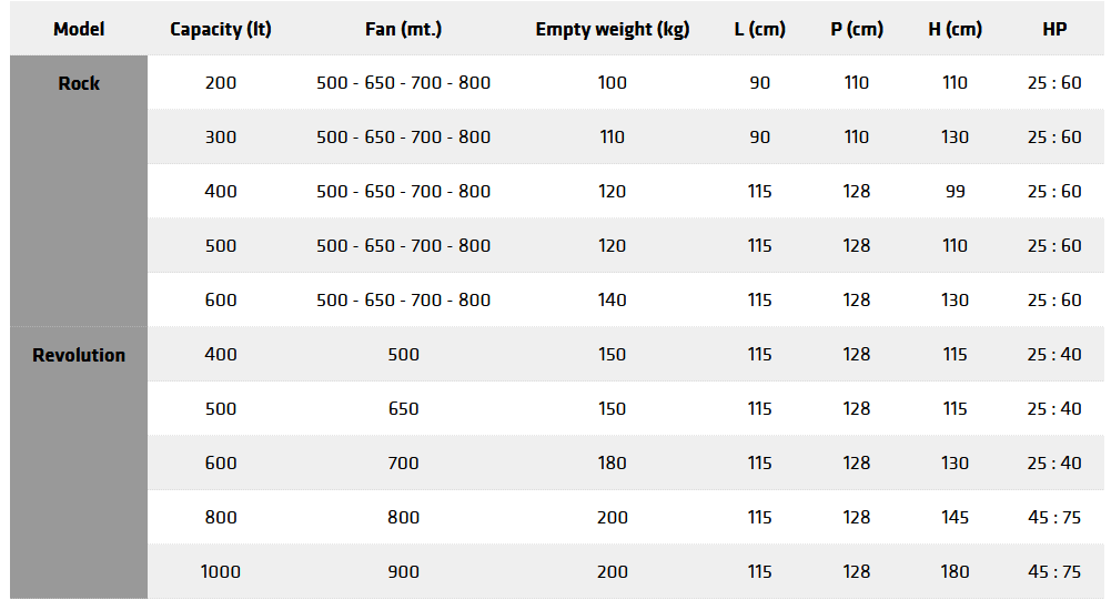 From 200 liters with fan diameter 500 for a small vineyard, up to 750 liters Revolution with a diameter of 900 for olive trees, the combinations are so much to satisfy any need for treatment of tree cultures.