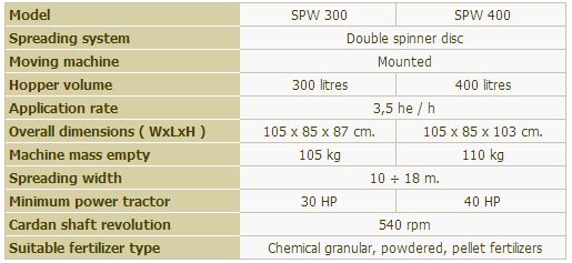 Steel frame 4 mm thick, sturdy contruction. Painted, rectangular fixed steel hopper. N°3 Aluminium gearbox with gears lubricated in oil bath. N°2 AISI 304 stainless steel spreading discs with 4 adjustable vanes. N°2 AISI 304 stainless steel flow controls with 2 adjustable openings. N°2 indipendent extensible levers to operate each single flow control opening. Standard spring agitators. Filtering grill. 3 points linkage, 1st, 2nd Cat. Cardan shaft L = 700 mm.