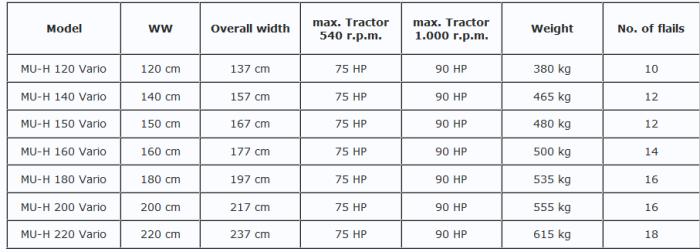 - Working width 1.20 m, 1.40 m, 1.50 m, 1.60 m, 1.80 m, 2.00 m, 2.20 m