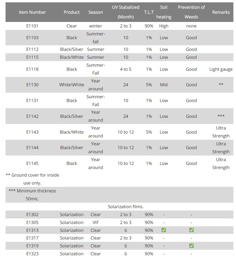 - Multicolor Films: films which combine the advantages of black or brown films in reducing weeds and the advantage of the selective films in preventing crop morbidity. The colors of the films can be adapted to suit the crop type and the growing season.