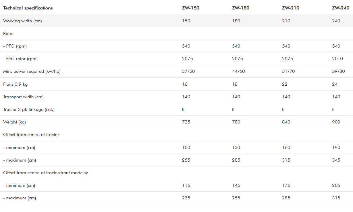 The ZW is equipped with 0.9 kg (2lbs) flails as standard; optionally, the machine can be equipped with Flex flails that offer excellent protection against rocks and other objects.
