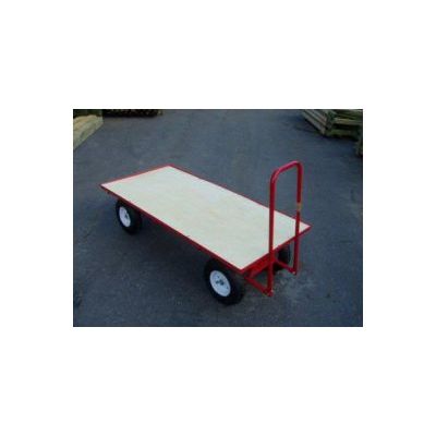 A multi purpose four wheel trolley with plywood top.Pneumatic wheels with turn table front wheel axle.300kg load capacity. 1.6mL x 0.75m W x 0.44m H.