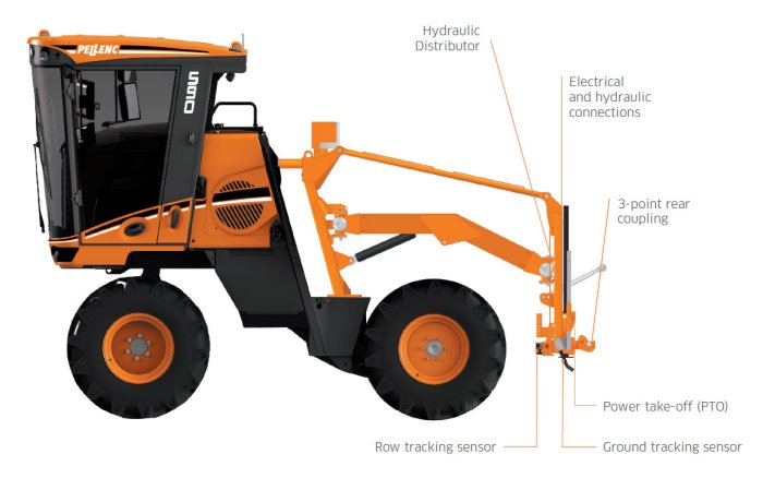 Adjustment of the position of the tools for automatic row entry. Automatic centring of the tools in the rows (sensors). Automation: ground tracking, slope correction and centring at the end of the row.