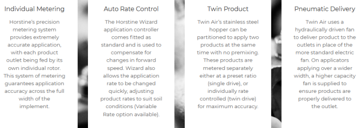 Horstine Twin Air is a versatile, multipurpose applicator able to apply products either on their own, or two products at the same time, without the need for premixing. This flexibility has ensured Twin Air is used on a vast range of applications with the farming industry, whilst applying a wide range of chemicals, fertilisers and seeds. Stainless steel construction and hydraulically driven fan and metering systems ensures Twin Air is able to withstand the harshest environments and the highest workloads.