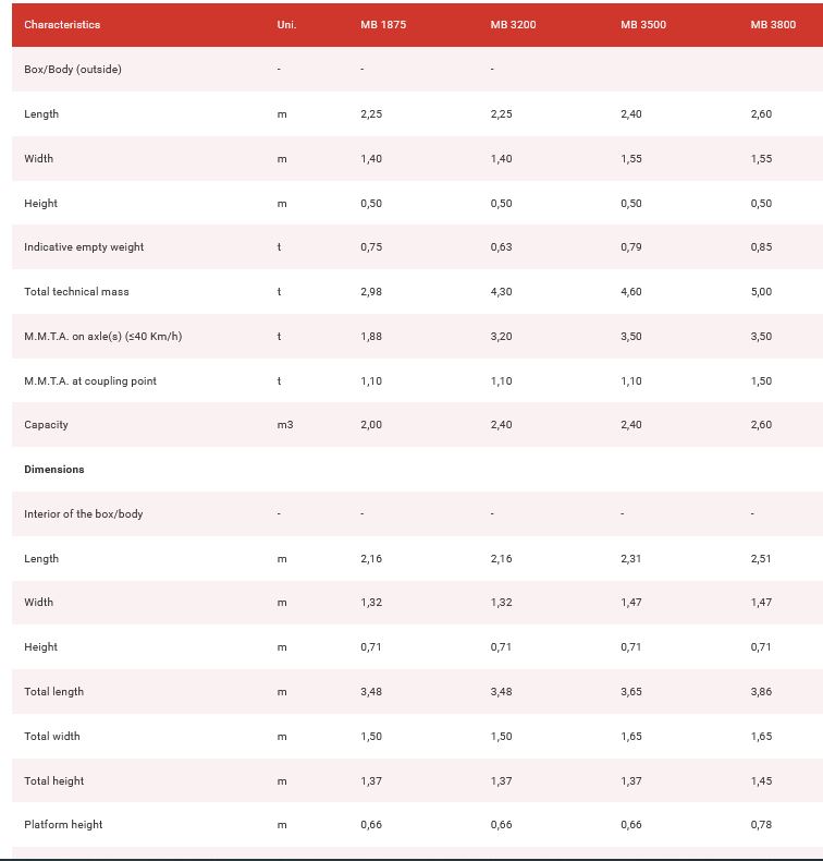 Characteristics: Trailers - 1 axle single-wheel. MB trailer box backwards tipping. Removable sidewall. Support leg (fuse). Safety device, lighting and signaling in accordance with current legislation.