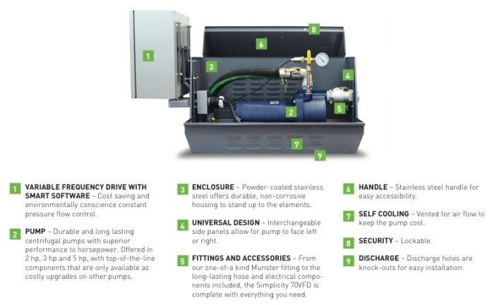 This self-contained pumping station is a low- maintenance, high-value solution for a large residential or small agricultural, municipal, or commercial irrigation system. With a variable frequency drive (VFD) and professional- grade pump, the Simplicity 70VFD is an alternative to across-the-line start, which can create pressure changes on low-gallon zones. This system offers a true soft start and soft stop.