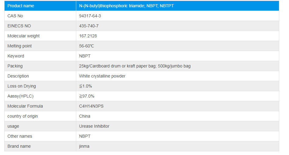NBPT is the most effective inhibitor of soil urease. Positive butyl thiophosphoric triamide as inhibitors of soil urease, efficient, non-toxic, on soil without side effects, and in the soil in the natural decomposition of ammonia and ammonium phosphate. NBPT can increase the efficiency of urea N by 30%.